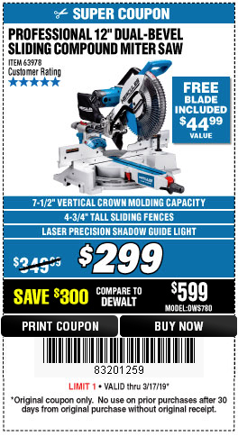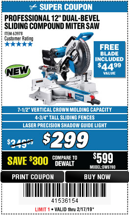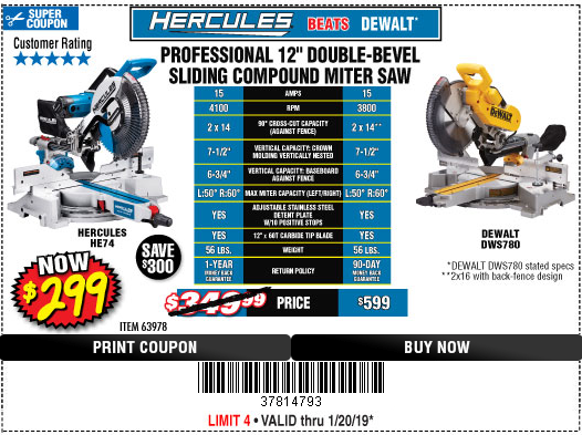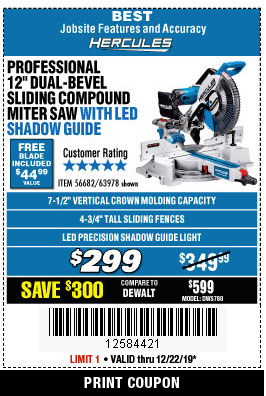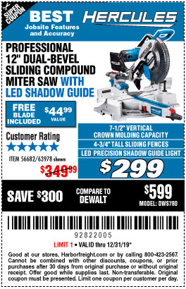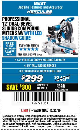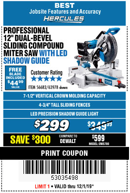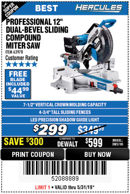 HERCULES 12 IN. DUAL-BEVEL SLIDING COMPOUND MITER SAW WITH PRECISION LED SHADOW GUIDE Lot No. 56682/63978 Expired: 3/31/19 - $299.99 Coupon Code: '12252729'