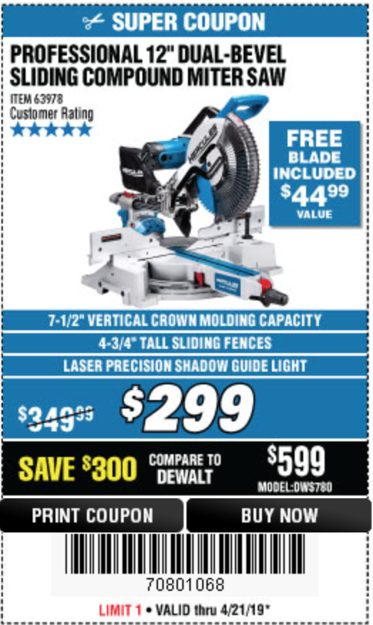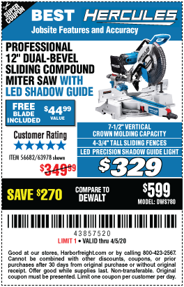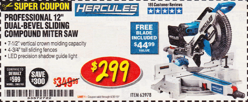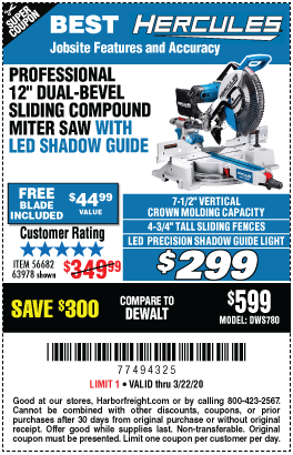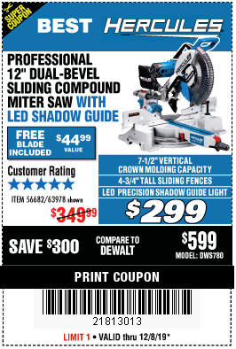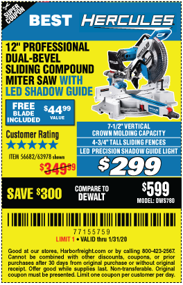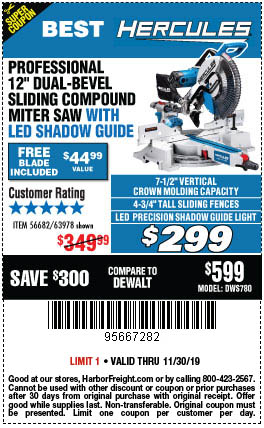 HERCULES 12 IN. DUAL-BEVEL SLIDING COMPOUND MITER SAW WITH PRECISION LED SHADOW GUIDE Lot No. 56682/63978 Expired: 4/7/19 - $299.99 Coupon Code: '10806994'