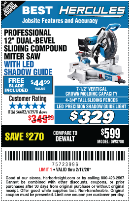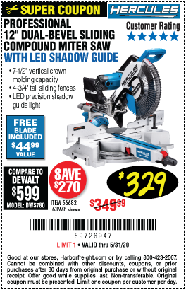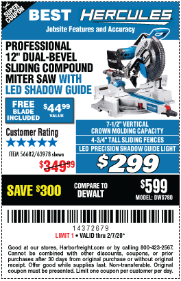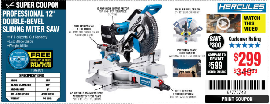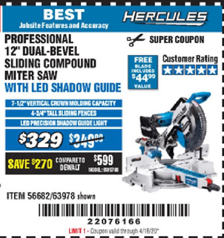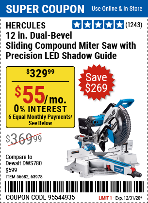 HERCULES 12 IN. DUAL-BEVEL SLIDING COMPOUND MITER SAW WITH PRECISION LED SHADOW GUIDE Lot No. 56682/63978 Expired: 6/30/20 - $329.99 Coupon Code: '99512923'