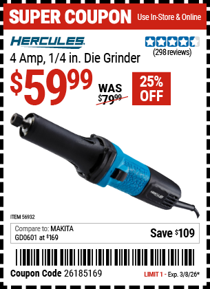 HERCULES 4 AMP, 1/4 IN. DIE GRINDER Lot No. 56932 Valid Thru: 3/8/26 - $59.99 Coupon Code: '26185169' (current price - 20% = 0) add to list