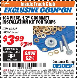 HFT 1/2 IN. GROMMET INSTALLATION KIT, 104-PIECE Lot No. 63237 Valid Thru: 12/3/25 - $4 Coupon Code: '62241102' (current price - 20% = 0) add to list