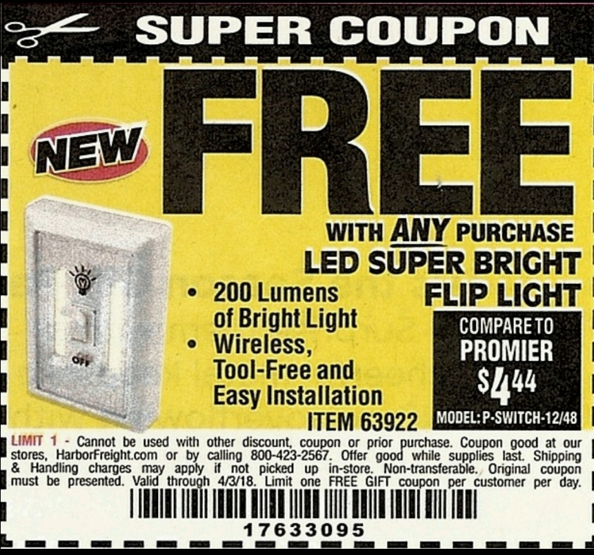 FREE 200 LUMEN LED SUPER-BRIGHT FLIP LIGHT Lot No. 64723/63922 Expired: 4/3/18 - FWP Coupon Code: '17633095'