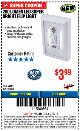 FREE 200 LUMEN LED SUPER-BRIGHT FLIP LIGHT Lot No. 64723/63922 Expired: 1/20/18 - FWP Coupon Code: '53016930'