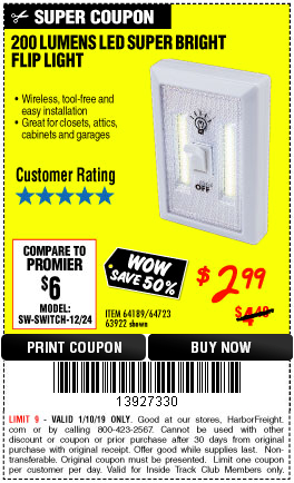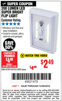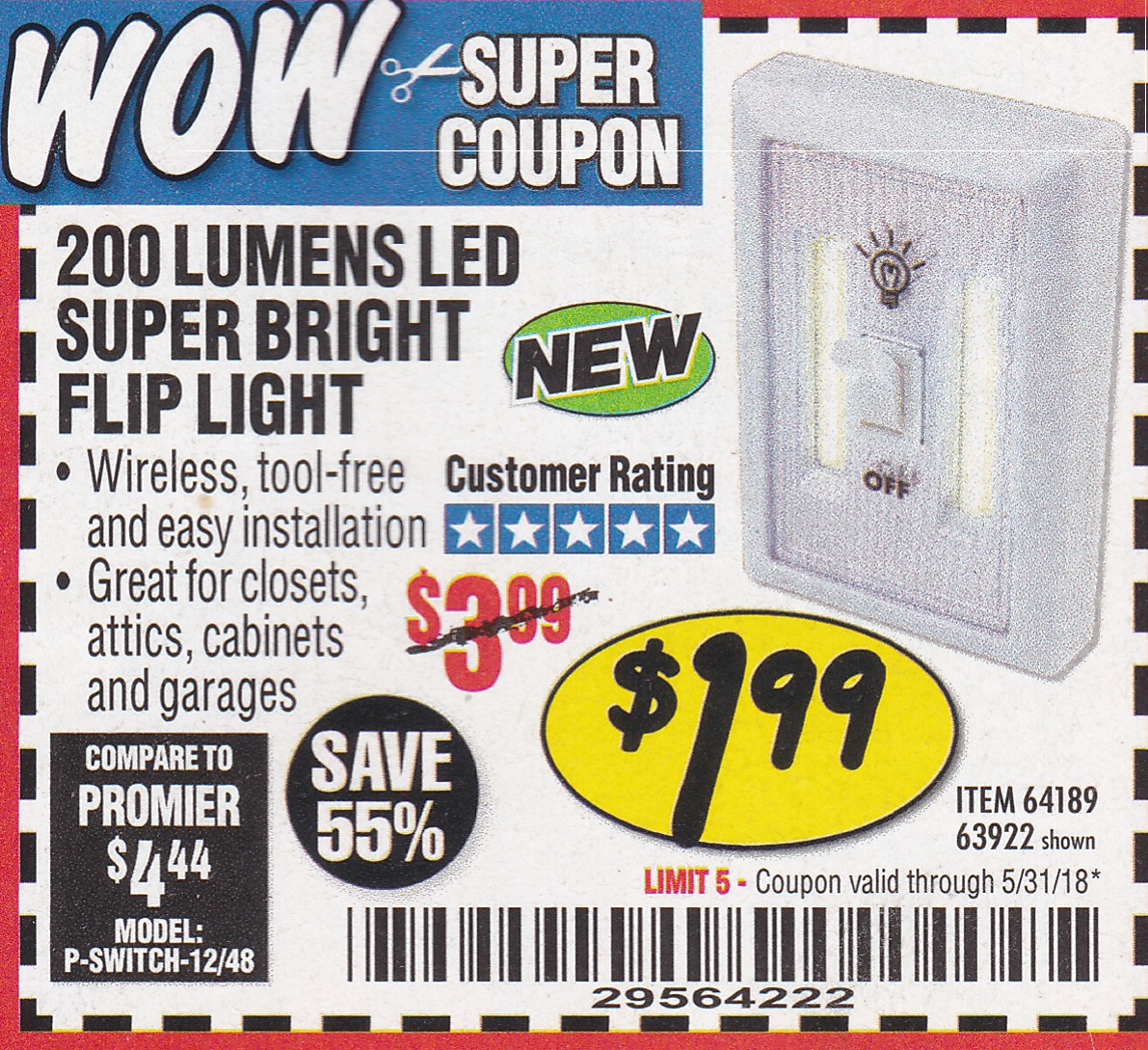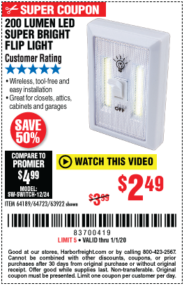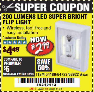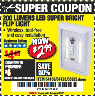 200 LUMEN LED SUPER-BRIGHT FLIP LIGHT Lot No. 64723/63922 Expired: 5/18/19 - $2.99 Coupon Code: '55249612'