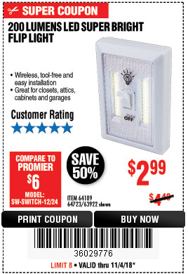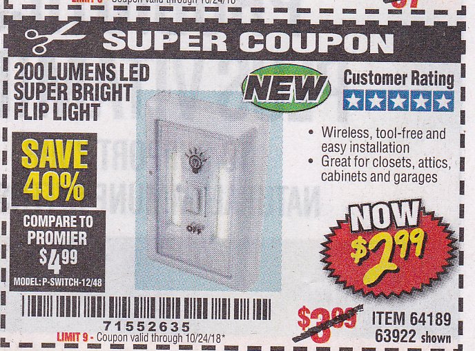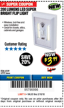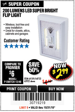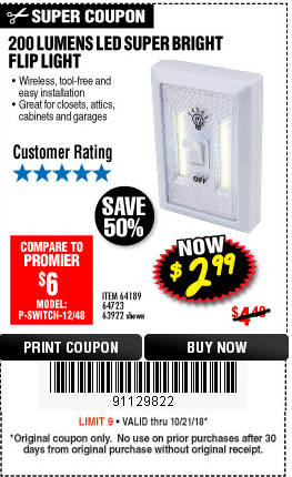 200 LUMEN LED SUPER-BRIGHT FLIP LIGHT Lot No. 64723/63922 Expired: 10/31/18 - $2.99 Coupon Code: '30719219'