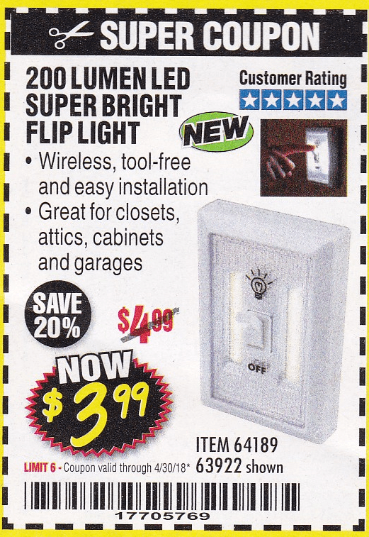 200 LUMEN LED SUPER-BRIGHT FLIP LIGHT Lot No. 64723/63922 Expired: 4/30/18 - $3.99 Coupon Code: '17705769'