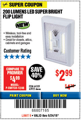 200 LUMEN LED SUPER-BRIGHT FLIP LIGHT Lot No. 64723/63922 Expired: 6/24/18 - $2.99 Coupon Code: '66807165'