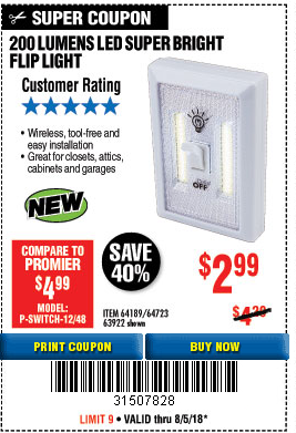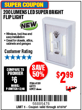200 LUMEN LED SUPER-BRIGHT FLIP LIGHT Lot No. 64723/63922 Expired: 8/5/18 - $2.99 Coupon Code: '31507828'