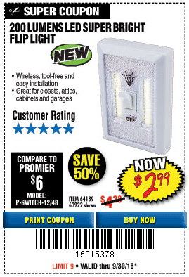200 LUMEN LED SUPER-BRIGHT FLIP LIGHT Lot No. 64723/63922 Expired: 9/30/18 - $2.99 Coupon Code: '15015378'