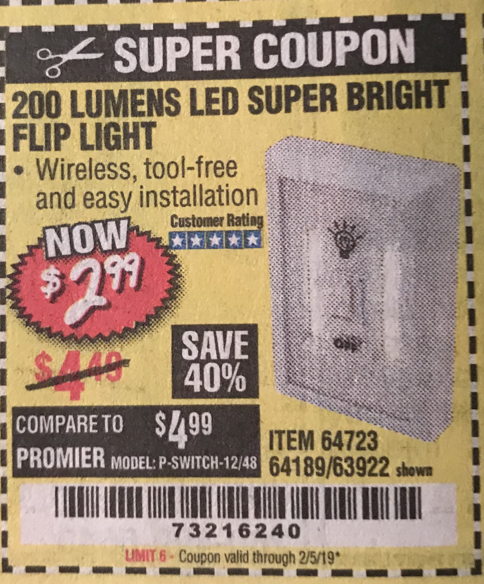 200 LUMEN LED SUPER-BRIGHT FLIP LIGHT Lot No. 64723/63922 Expired: 2/5/19 - $2.99 Coupon Code: '73216240'