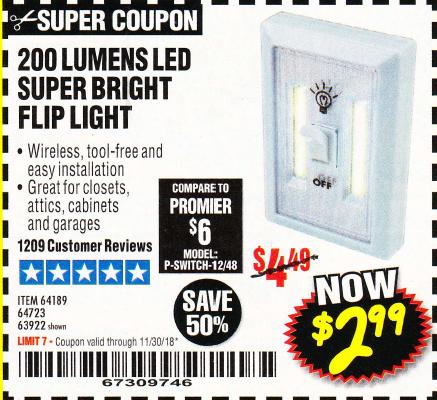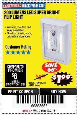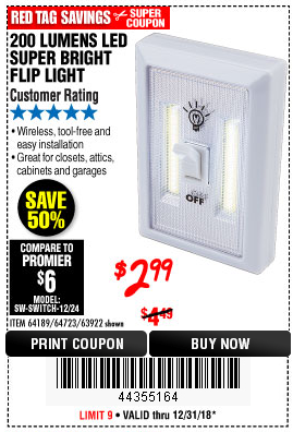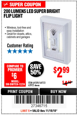 200 LUMEN LED SUPER-BRIGHT FLIP LIGHT Lot No. 64723/63922 Expired: 11/18/18 - $2.99 Coupon Code: '27346715'