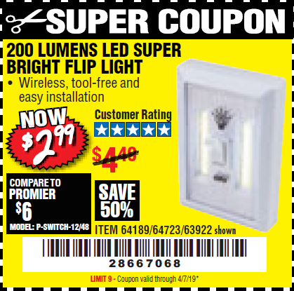 200 LUMEN LED SUPER-BRIGHT FLIP LIGHT Lot No. 64723/63922 Expired: 4/7/19 - $2.99 Coupon Code: '28667068'