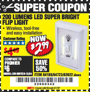 200 LUMEN LED SUPER-BRIGHT FLIP LIGHT Lot No. 64723/63922 Expired: 4/1/19 - $2.99 Coupon Code: '22660342'