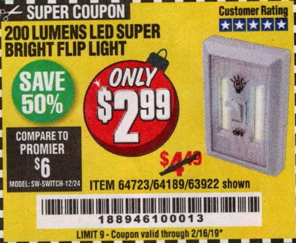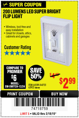 200 LUMEN LED SUPER-BRIGHT FLIP LIGHT Lot No. 64723/63922 Expired: 2/16/19 - $2.99 Coupon Code: '18894610'