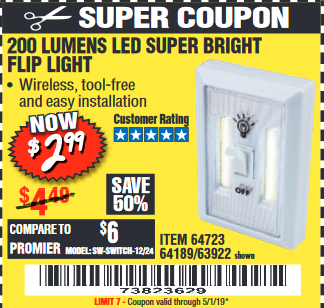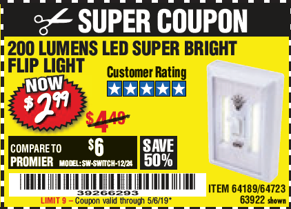 200 LUMEN LED SUPER-BRIGHT FLIP LIGHT Lot No. 64723/63922 Expired: 5/1/19 - $2.99 Coupon Code: '73823629'