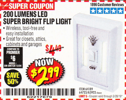 200 LUMEN LED SUPER-BRIGHT FLIP LIGHT Lot No. 64723/63922 Expired: 2/28/19 - $2.99 Coupon Code: '62217679'