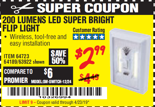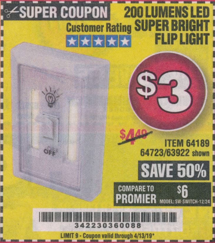 200 LUMEN LED SUPER-BRIGHT FLIP LIGHT Lot No. 64723/63922 Expired: 3/23/19 - $2.99 Coupon Code: '57771625'