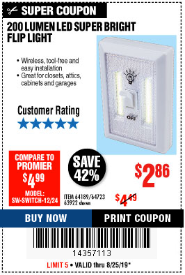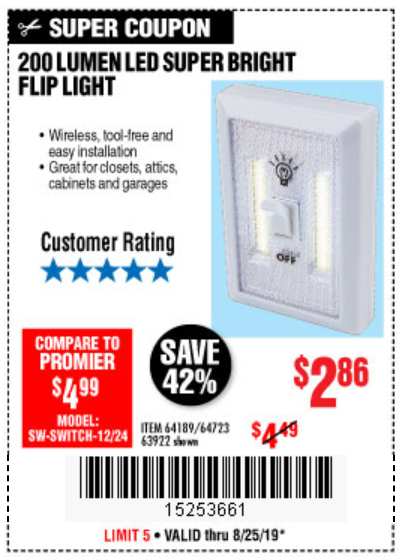 200 LUMEN LED SUPER-BRIGHT FLIP LIGHT Lot No. 64723/63922 Expired: 5/11/19 - $2.99 Coupon Code: '43594392'