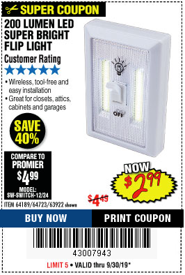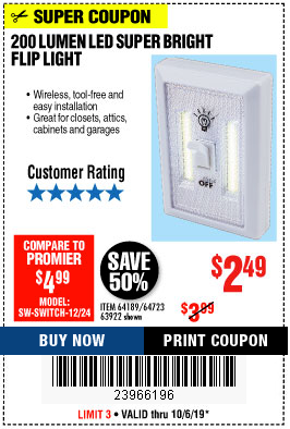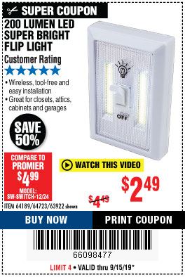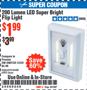 200 LUMEN LED SUPER-BRIGHT FLIP LIGHT Lot No. 64723/63922 Expired: 9/30/19 - $2.99 Coupon Code: '43007943'