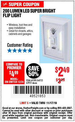 200 LUMEN LED SUPER-BRIGHT FLIP LIGHT Lot No. 64723/63922 Expired: 11/17/19 - $2.49 Coupon Code: '48521653'