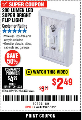 200 LUMEN LED SUPER-BRIGHT FLIP LIGHT Lot No. 64723/63922 Expired: 12/31/19 - $1.99 Coupon Code: '92153350'