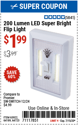 200 LUMEN LED SUPER-BRIGHT FLIP LIGHT Lot No. 64723/63922 Expired: 7/15/20 - $1.99 Coupon Code: '71117851'