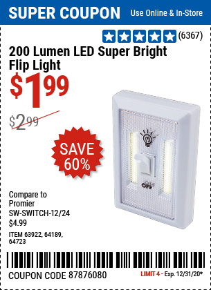 200 LUMEN LED SUPER-BRIGHT FLIP LIGHT Lot No. 64723/63922 Expired: 12/31/20 - $1.99 Coupon Code: '87876080'