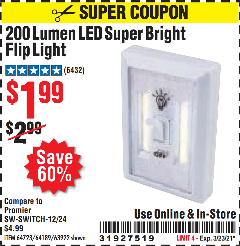 200 LUMEN LED SUPER-BRIGHT FLIP LIGHT Lot No. 64723/63922 Expired: 3/23/21 - $1.99 Coupon Code: '31927519'