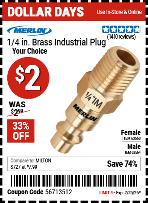 MERLIN 1/4 IN. INDUSTRIAL PLUG Lot No. 63563/63564 Expired: 12/28/25 - $1.99 Coupon Code: '70778627'
