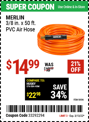 MERLIN 3/8" X 50 FT PVC AIR HOSE Lot No. 58506 Expired: 3/13/22 - $14.99 Coupon Code: '33292294'