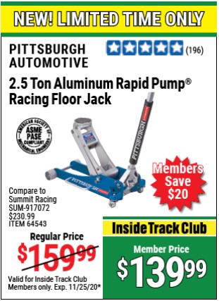 PITTSBURGH 2.5 TON LOW-PROFILE ALUMINUM RACING FLOOR JACK WITH RAPID PUMP Lot No. 64543/64553 Expired: 1/31/20 - $139.99 Coupon Code: '77198383'