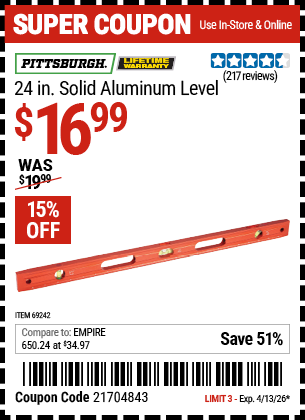 PITTSBURGH 24 IN. SOLID ALUMINUM LEVEL Lot No. 69242 Valid Thru: 4/13/26 - $16.99 Coupon Code: '21704843' (current price - 20% = 0) add to list