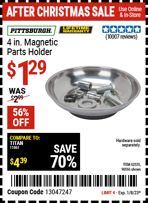 PITTSBURGH 4 IN. MAGNETIC PARTS HOLDER Lot No. 13047247 Expired: 1/8/23 - $1.29 Coupon Code: '13047247'