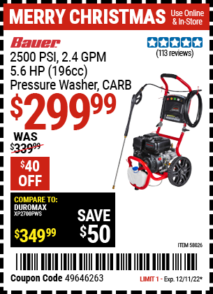 PREDATOR 2500 PSI, 2.4 GPM 5.6 HP (196CC) PRESSURE WASHER Lot No. 58026 Expired: 12/11/22 - $299.99 Coupon Code: '49646263'