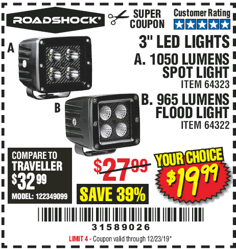 ROADSHOCK 965 LUMENS 3" FLOOD LIGHT OR 1050 LUMENS 3" SPOT LIGHT Lot No. 64322/64323 Expired: 12/23/19 - $19.99 Coupon Code: '31589026'