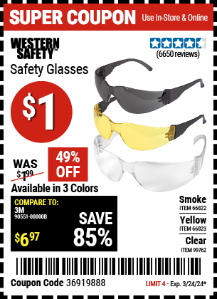 SAFETY GLASSES - VARIOUS COLORS Lot No. 66822/66823/63851/99762 Expired: 6/30/20 - $1.29 Coupon Code: '93000652'