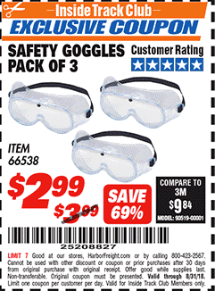 ITC SAFETY GOGGLES PACK OF 3 Lot No. 94027 Expired: 8/31/18 - $2.99 Coupon Code: '25208827'