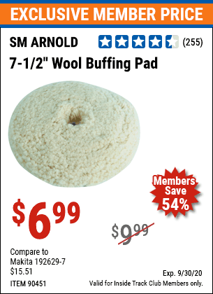 ITC SM ARNOLD 7-1/2 IN WOOL BUFFING PAD Lot No. 90451 Expired: 9/30/20 - $6.99 Coupon Code: 'n/a'