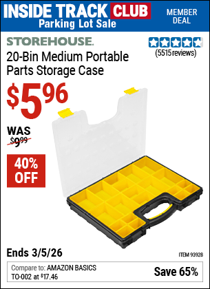 ITC STOREHOUSE 20-BIN MEDIUM PORTABLE PARTS STORAGE CASE Lot No. 62778/93928 Valid Thru: 3/5/26 - $5.96 Coupon Code: 'n/a' (current price - 20% = 0) add to list
