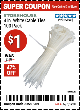ITC STOREHOUSE 4 IN. WHITE CABLE TIES, 100-PACK Lot No. 60257 Expired: 5/1/25 - $0.79 Coupon Code: 'n/a'