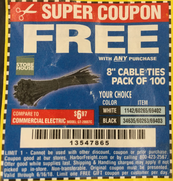 FREE STOREHOUSE 8 IN. CABLE TIES, 100-PACK Lot No. 1142/69402/60265/34635/69403/60263 Expired: 6/16/18 - FWP Coupon Code: '13547865'