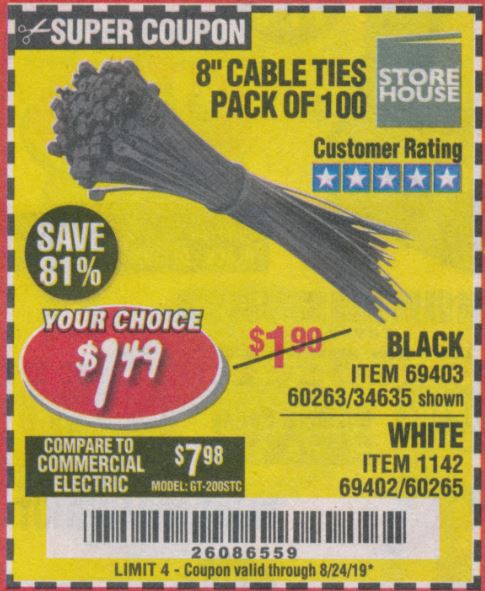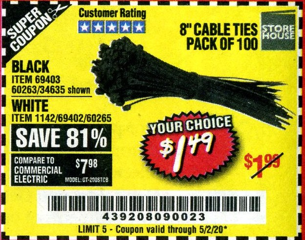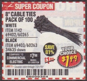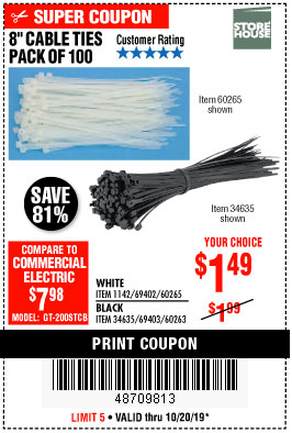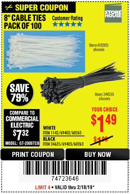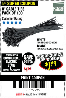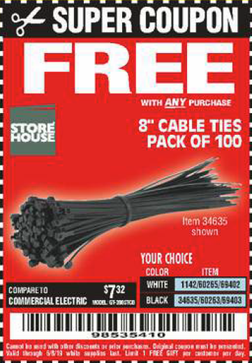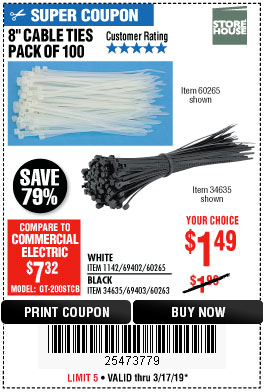 FREE STOREHOUSE 8 IN. CABLE TIES, 100-PACK Lot No. 1142/69402/60265/34635/69403/60263 Expired: 6/5/19 - FWP Coupon Code: '98535410'