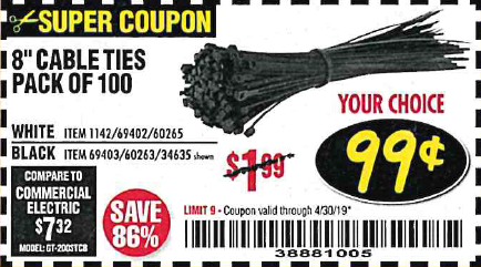 STOREHOUSE 8 IN. CABLE TIES, 100-PACK Lot No. 1142/69402/60265/34635/69403/60263 Expired: 4/30/19 - $0.99 Coupon Code: '38881005'