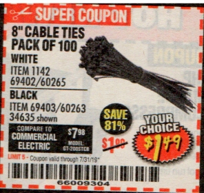 STOREHOUSE 8 IN. CABLE TIES, 100-PACK Lot No. 1142/69402/60265/34635/69403/60263 Expired: 7/31/19 - $1.49 Coupon Code: '66009304'