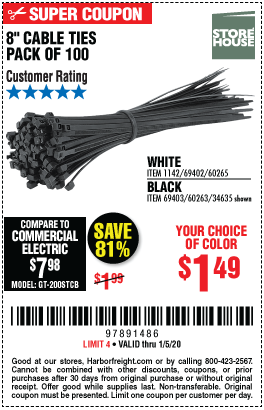 STOREHOUSE 8 IN. CABLE TIES, 100-PACK Lot No. 1142/69402/60265/34635/69403/60263 Expired: 1/5/20 - $1.49 Coupon Code: '97891486'