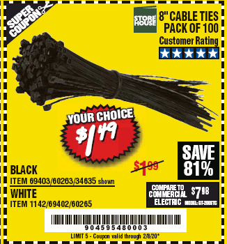 STOREHOUSE 8 IN. CABLE TIES, 100-PACK Lot No. 1142/69402/60265/34635/69403/60263 Expired: 2/8/20 - $1.49 Coupon Code: '90459548'