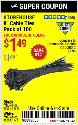 FREE STOREHOUSE 8 IN. CABLE TIES, 100-PACK Lot No. 1142/69402/60265/34635/69403/60263 Expired: 7/31/16 - FWP Coupon Code: '74411796'