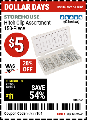 STOREHOUSE HITCH CLIP ASSORTMENT, 150 PIECE Lot No. 67557 Expired: 12/13/24 - $0.05 Coupon Code: '20288104'