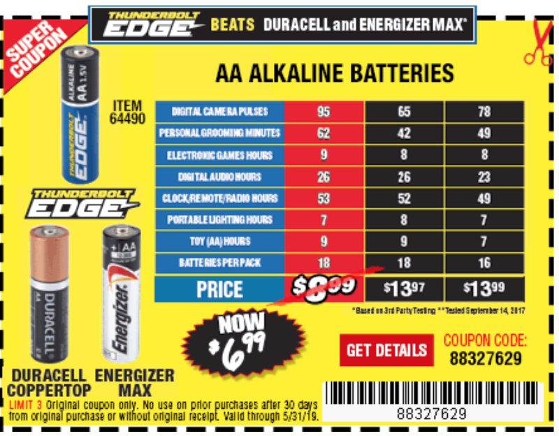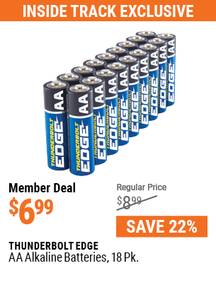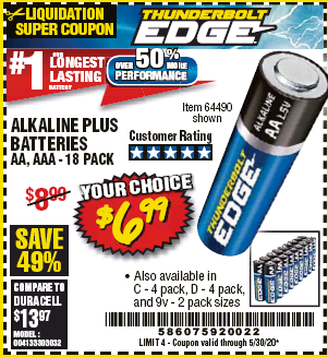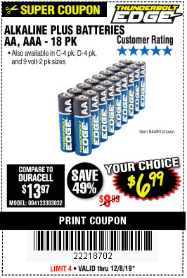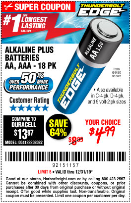 THUNDERBOLT EDGE AA PRIME POWER ALKALINE BATTERIES, 18-PACK Lot No. 64490/64490/64491/64492/64493 Expired: 9/5/19 - $6.99 Coupon Code: '64434781'