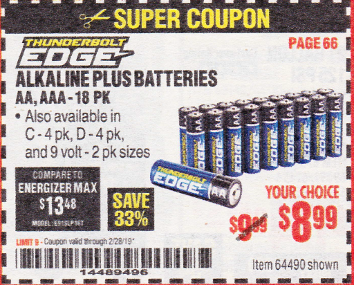THUNDERBOLT EDGE AA PRIME POWER ALKALINE BATTERIES, 18-PACK Lot No. 64490/64490/64491/64492/64493 Expired: 2/28/19 - $8.99 Coupon Code: '14489496'